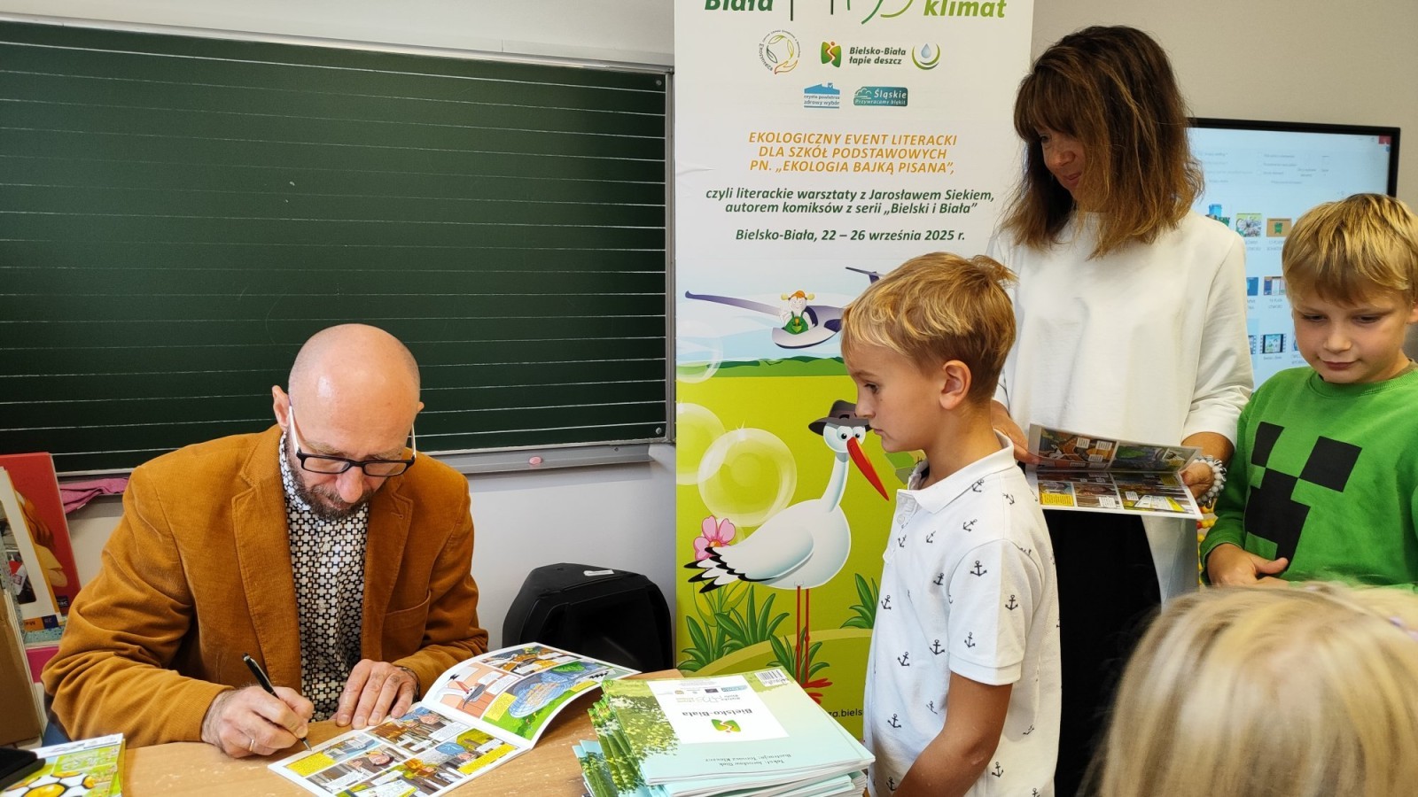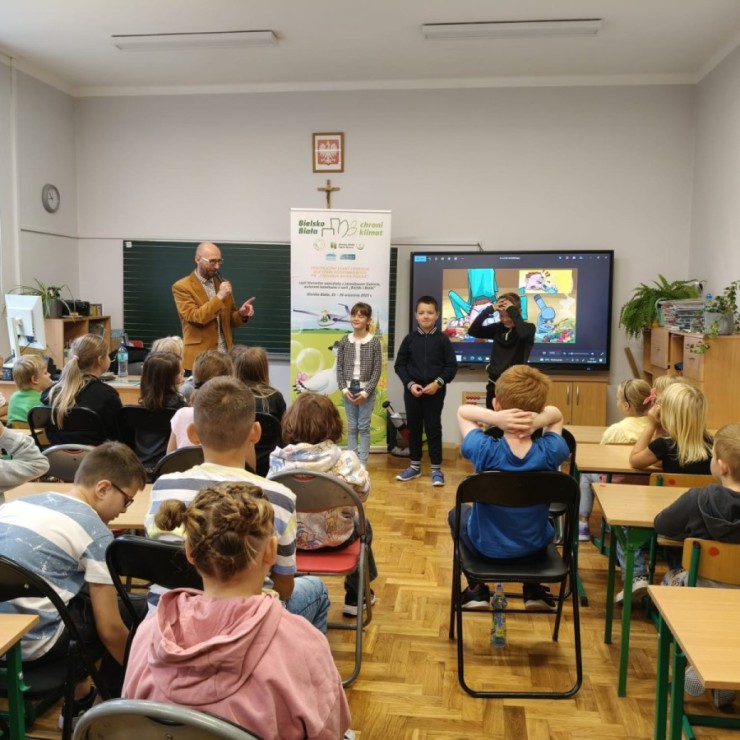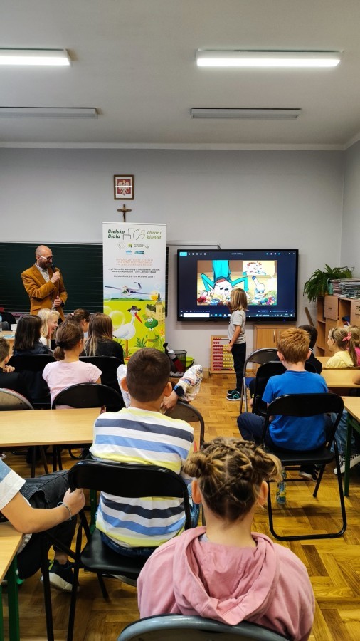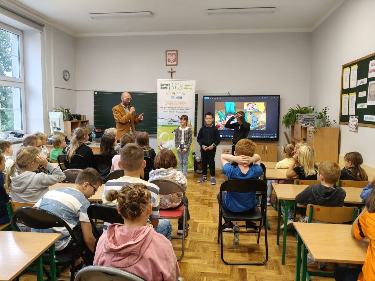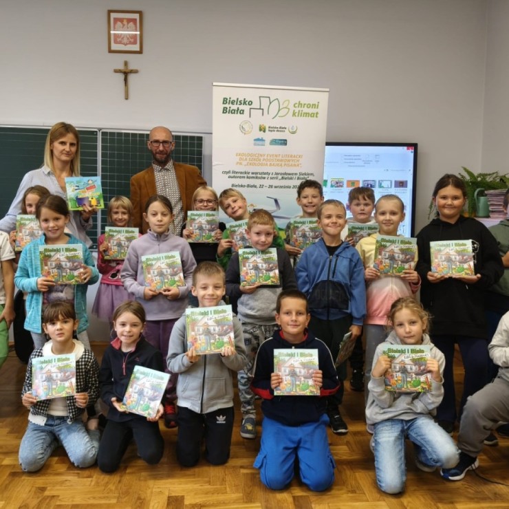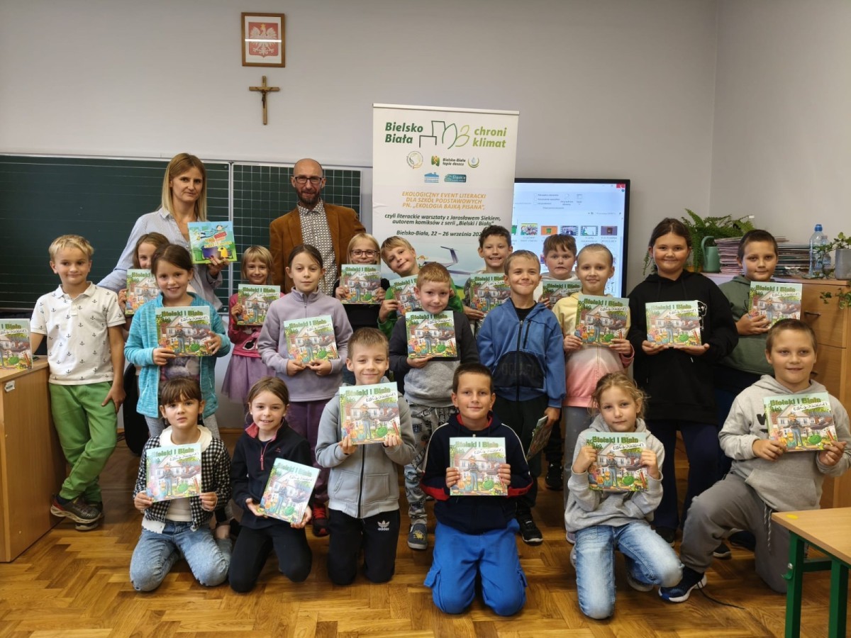 Nasza szkoła otrzymała nagrodę za ogromne zaangażowanie społeczności szkolnej w 15 edycję konkursu "Szanuj energię, chroń klimat". Nagroda ufundowana została przez Urząd Miejski w Bielsku-Białej a było nią spotkanie z Panem Jarosławem Siekiem autorem komiksów z serii "Bielski i Biała". Podczas spotkania odbyły się warsztaty literackie pt. "Ekologia bajką pisana". Uczniowie poprzez zabawę wykorzystując komiksy i bajki rozmawiali o ochronie środowiska i oszczędzaniu energii. Dowiedzieli się jak pisać komiksy, jak wymyślać bohaterów i tworzyć miejsca akcji. Wcielali się w rolę tych bohaterów i odgrywali scenki związane z ekologią. Na koniec każdy otrzymał najnowszy komiks autorstwa Pana Sieka pt. "Bielski i Biała łapią oddech" wraz z autografem.