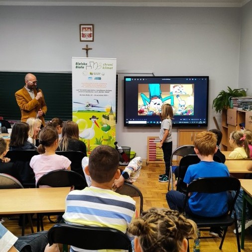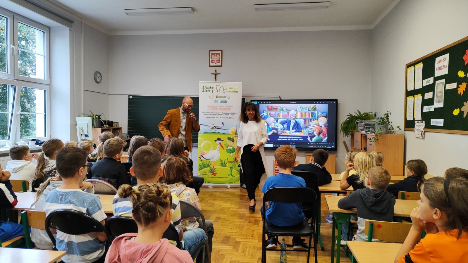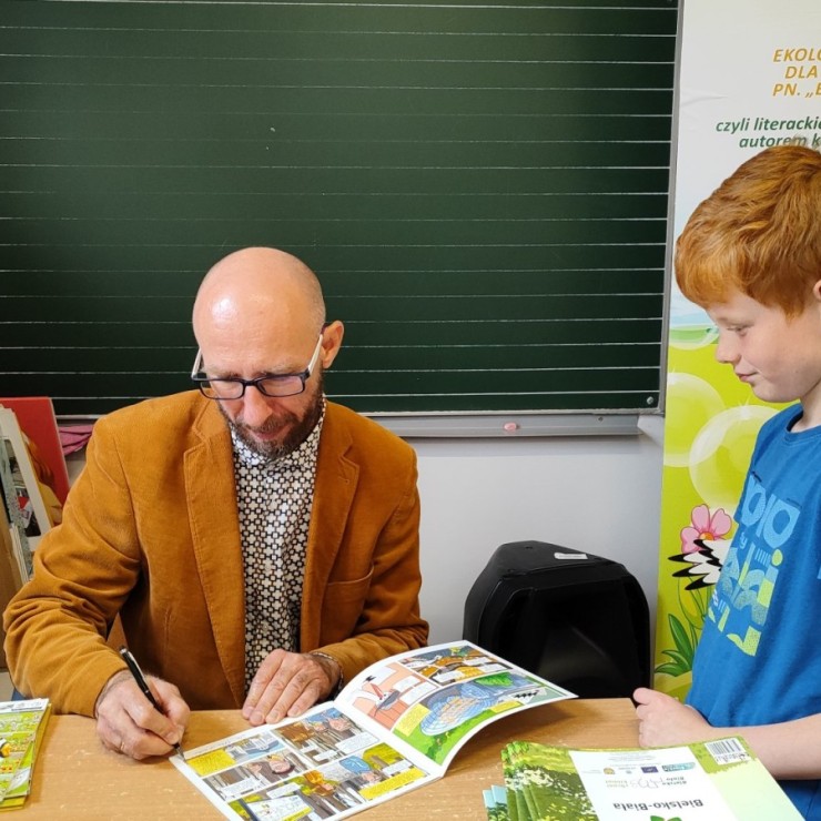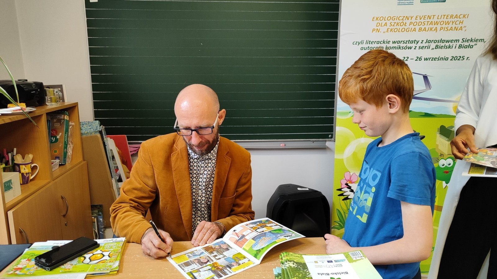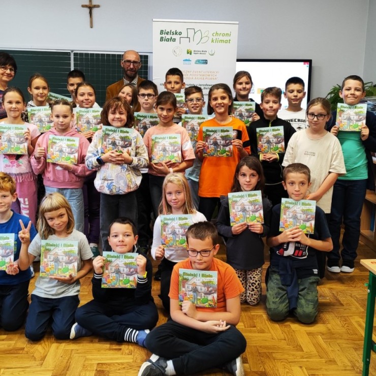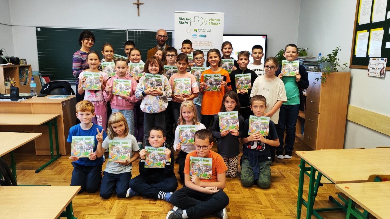 Nasza szkoła otrzymała nagrodę za ogromne zaangażowanie społeczności szkolnej w 15 edycję konkursu "Szanuj energię, chroń klimat". Nagroda ufundowana została przez Urząd Miejski w Bielsku-Białej a było nią spotkanie z Panem Jarosławem Siekiem autorem komiksów z serii "Bielski i Biała". Podczas spotkania odbyły się warsztaty literackie pt. "Ekologia bajką pisana". Uczniowie poprzez zabawę wykorzystując komiksy i bajki rozmawiali o ochronie środowiska i oszczędzaniu energii. Dowiedzieli się jak pisać komiksy, jak wymyślać bohaterów i tworzyć miejsca akcji. Wcielali się w rolę tych bohaterów i odgrywali scenki związane z ekologią. Na koniec każdy otrzymał najnowszy komiks autorstwa Pana Sieka pt. "Bielski i Biała łapią oddech" wraz z autografem.