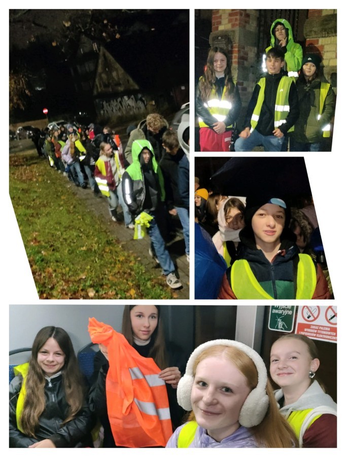 Uczniowie klasy 7b i 7c wzięli udział w wyjątkowym wieczornym spacerze promującym noszenie odblasków. Celem akcji było przypomnienie, jak ważne jest bycie widocznym na drodze – zwłaszcza jesienią i zimą, gdy szybko zapada zmrok.